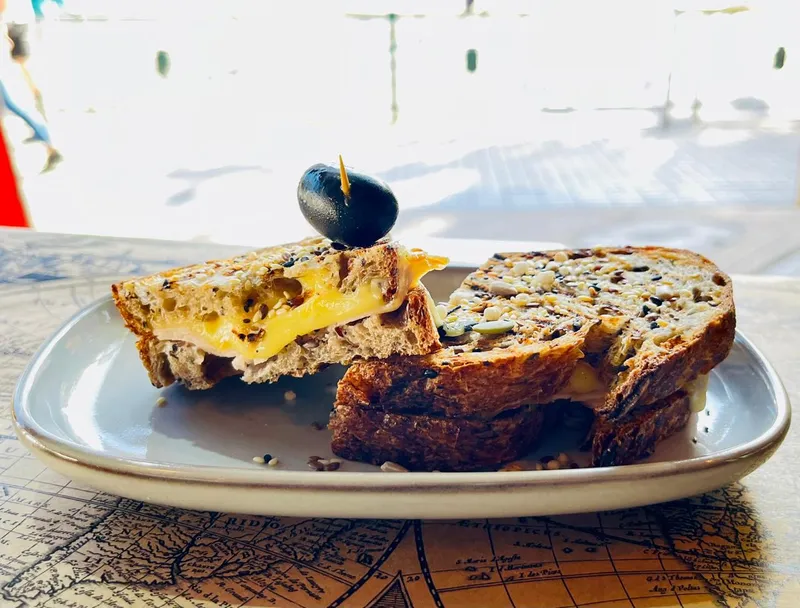 La tostada, crujiente y dorada, está cubierta con una capa generosa de queso crema, que sirve de base suave y rica. Se añaden finas lonchas de jamón serrano, que aportan un toque salado y curado, y una mermelada de aceituna que ofrece una combinación dulce y salada. Las alcaparras añaden un matiz ácido y sabroso, mientras que el mix de semillas proporciona un toque crujiente y extra de sabor.