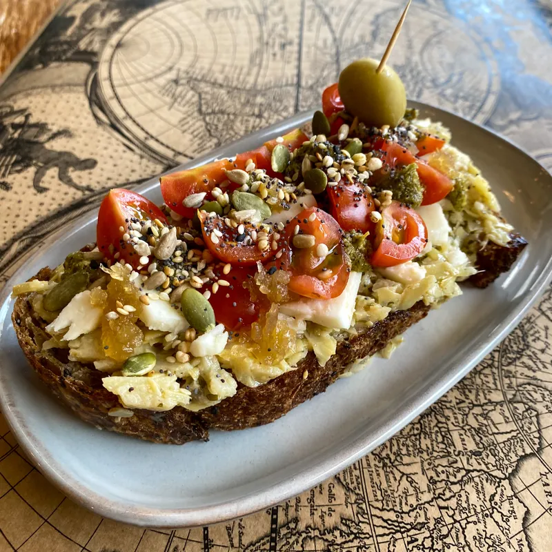 Una deliciosa y saludable combinación en cada bocado. La rodaja de pan de masa madre tostado sirve como base crujiente para una generosa capa de hummus de garbanzo y tahine, que aporta una textura cremosa y un sabor profundo y nutrioso. La rodaja se completa con tomates cherry frescos, rúcula vibrante, y un toque de dulce de aceituna negra que añade una nota única de sabor. Todo ello está coronado con un mix de semillas que proporciona un toque adicional de textura y sabor